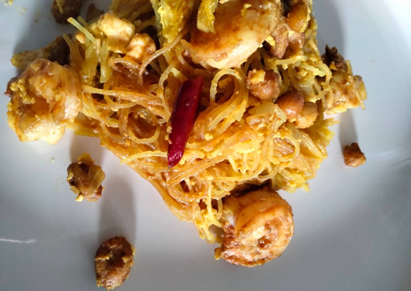 Se trata de un plato salteado en wok a base de tallarines de arroz con huevos, salsa de pescado, pimiento rojo, camarones, con cacahuates. #cocinaoriental