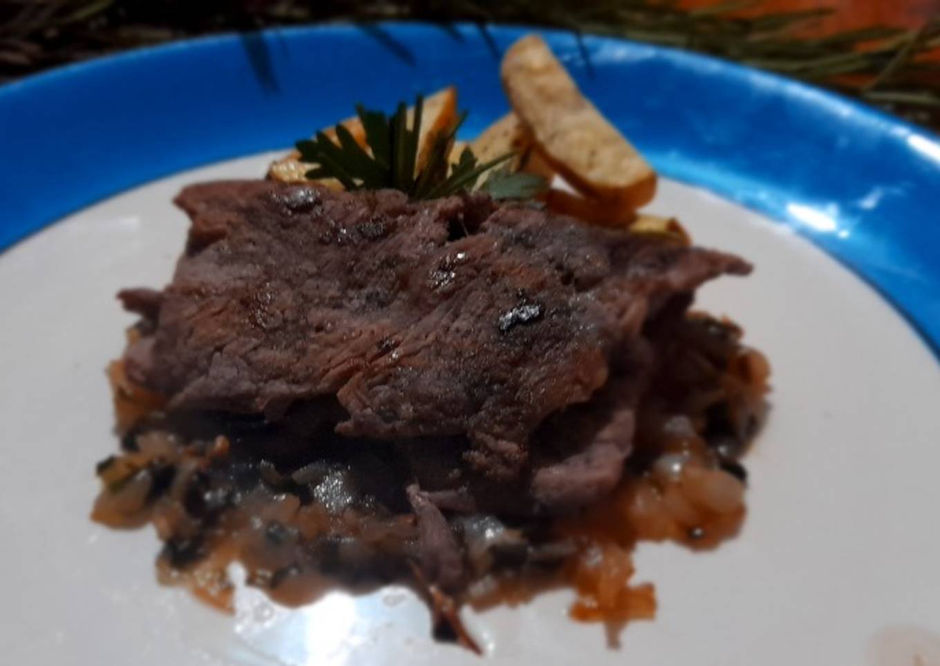 - Cuando nuestras papas estén listas, servimos en un plato la cebolla con perejil, colocamos nuestra carne por encima y colocamos las papas como guarnición