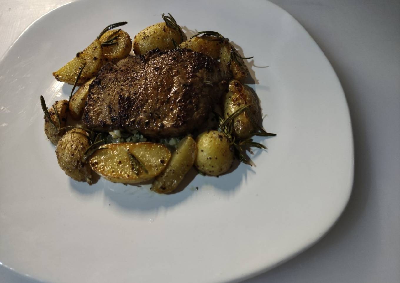 - Finalizado todos estos pasos, procederemos a montar nuestro plato. Primero agregando nuestras papas de manera en que se forme un círculo. Dentro del cual agregaremos nuestra mezcla de ajo, cebolla y cilantro. Y por último, colocaremos nuestro filete.