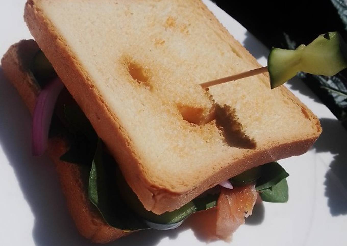 - Barnizamos nuestras piezas de pan con mayonesa y mostaza, cubrimos con las espinacas, ponemos el salm贸n.
