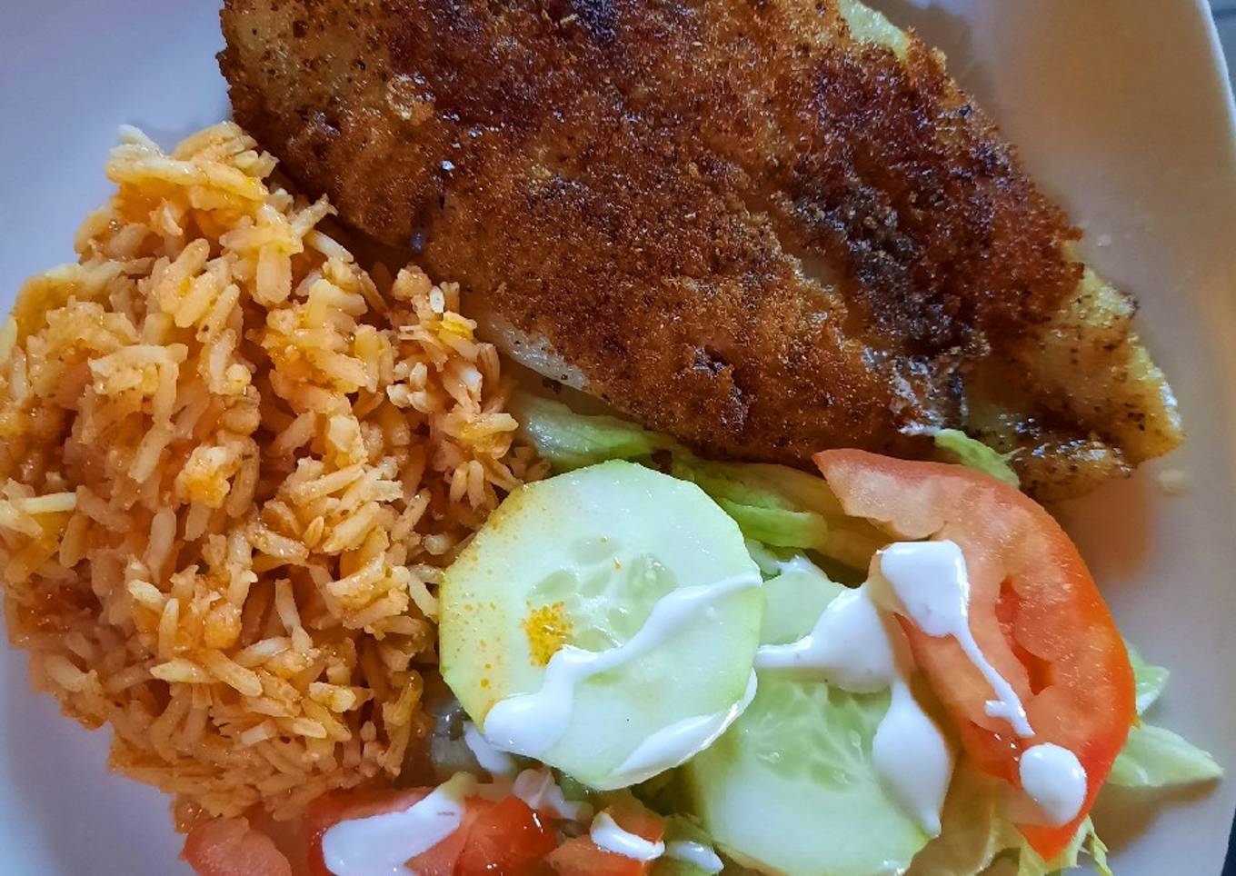 - El pescado le puse sal al gusto y lo empanice con pan molido y lo freí en aceite de oliva. Por 6 min. De cada lado como no es muy grueso es rápido.