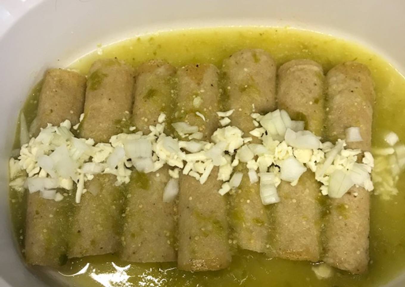 Pasamos por aceite caliente unas 8 tortillas, les ponemos a cada una una cucharada de queso, las enrollamos y colocamos en un platón, las cubrimos con la salsa, les ponemos queso panela rallado por encima y cebolla picada.
