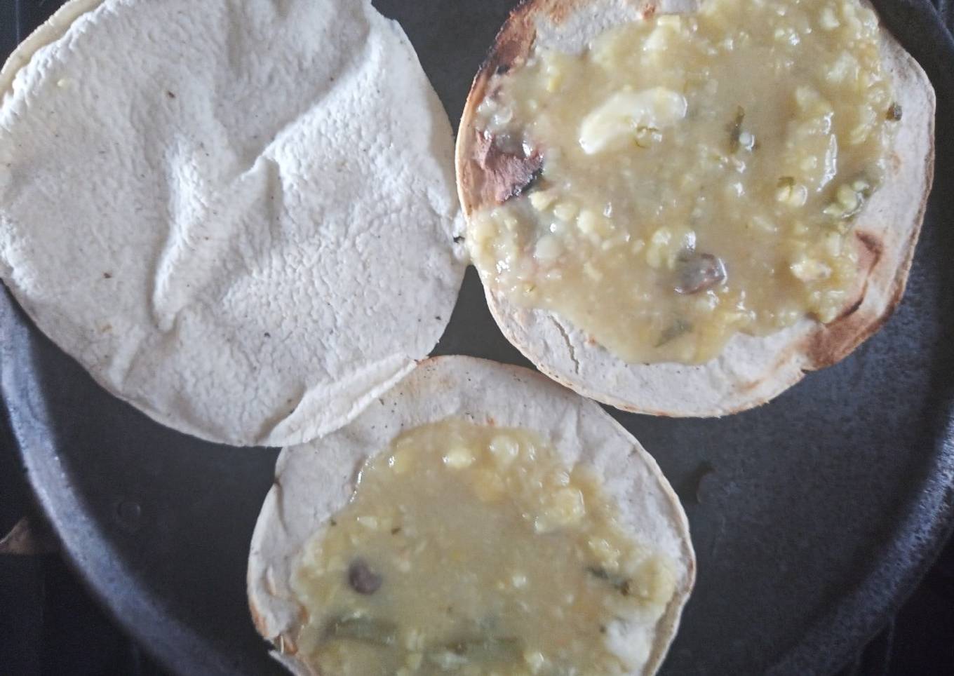 - Coloca las tortillas de ma铆z a tatemar en un comal. Cuando comience a tatemar agrega un par de cucharadas de caldo de habas y termina de tostar.