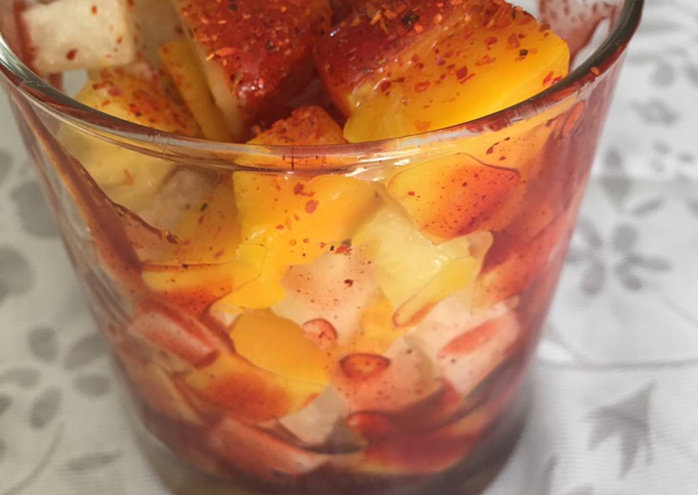 - Servir en vasos o copas y bañar con salsa chamoy y Tajín.