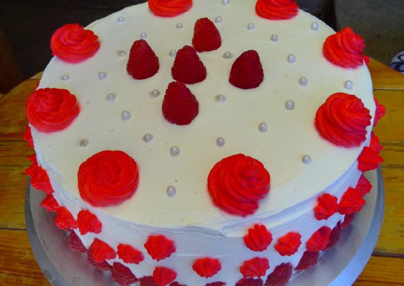 - Colocaremos nuestro pan sobre nuestra base giratoria y comenzaremos a rellenar, colocando un poco de crema sobre nuestro bizcocho, la esparciremos bien y después agregaremos las cerezas y frambuesas, después colocaremos un bizcocho sobre el anterior y repetiremos el procedimiento del relleno.