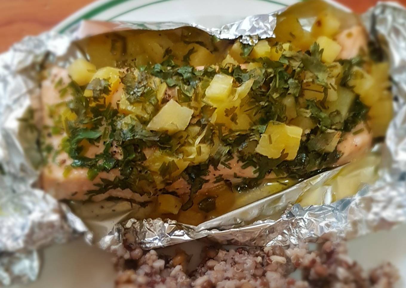 Suelo comer salmón una vez a la semana y, para no aburrirme, voy buscando combinaciones que le den variedad a mi dieta. Esta es una receta fácil de preparar, rica y sana. #reto21días #piña #cuidatusalud #saludable #DASH