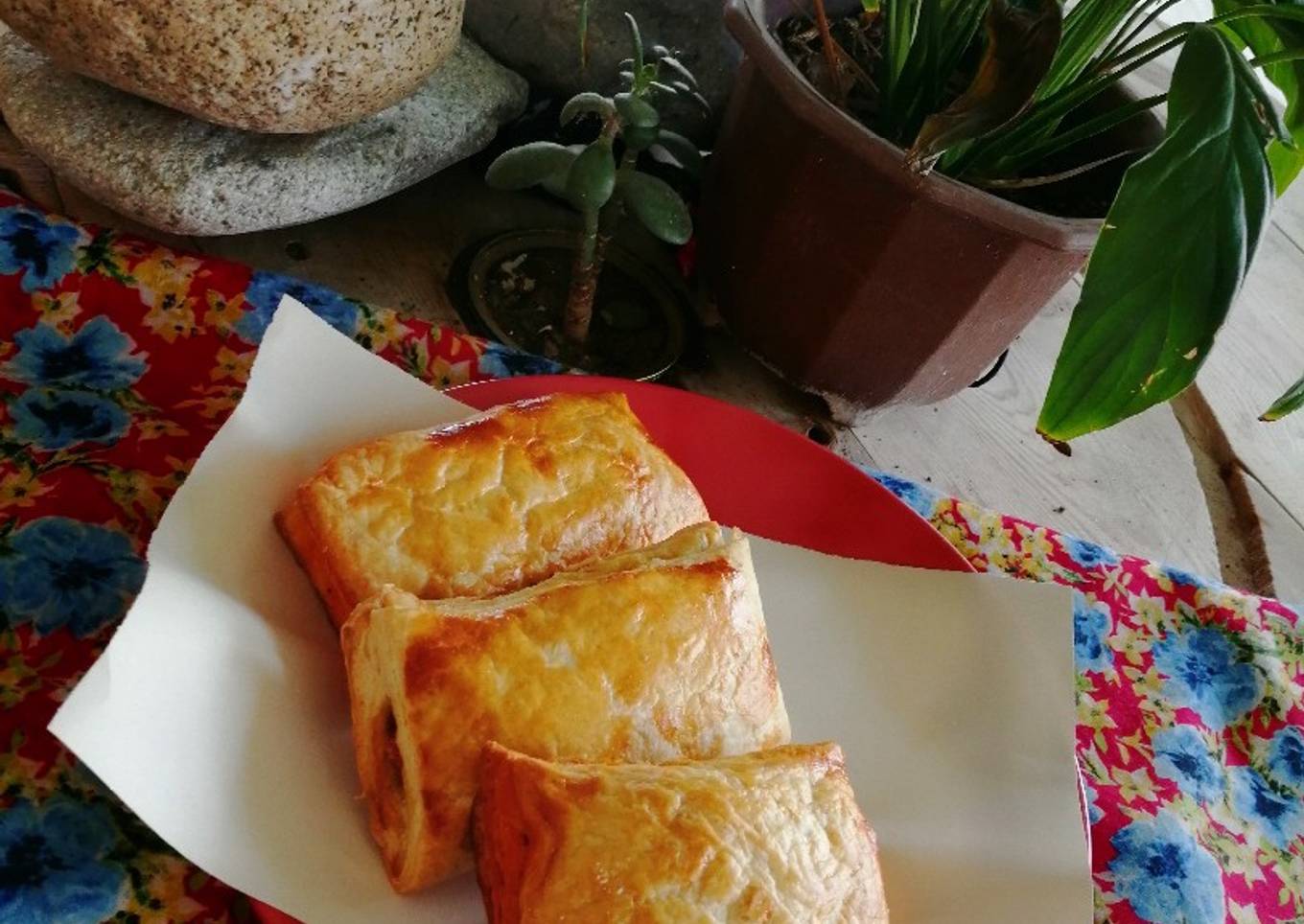 - Primero vamos a extender nuestra masa hojaldre, después cortaremos cuadrados para formar triángulos y otras en forma de rectángulo.