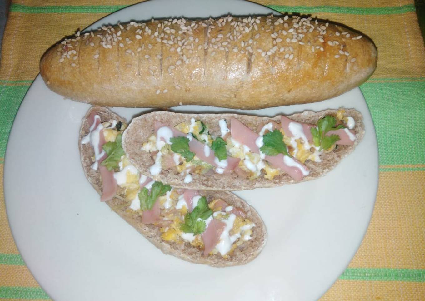 - Ya que estuvo lista en este caso yo la corté por la mitad a lo largo, la rellené con huevos con jamón y un poco de crema.