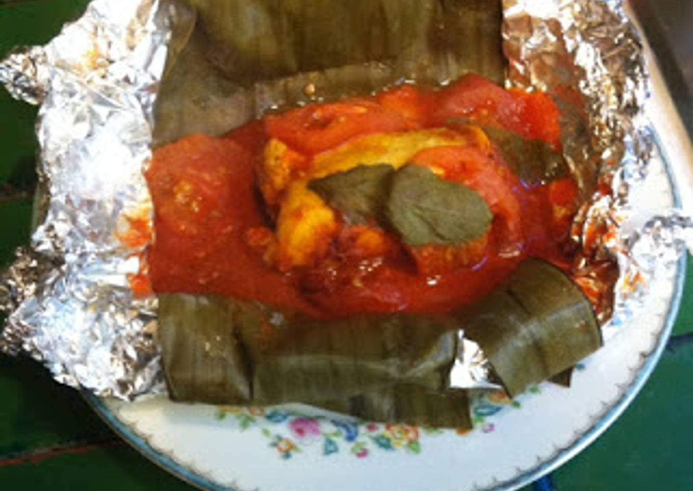 - Encima de la hoja de plátano colocamos una rebanada de cebolla, vamos tomando cada pieza de pollo y la mojamos en la salsa de achiote y la colocamos sobre la rebanada de cebolla, pelamos un jitomate y lo cortamos en rodajas y colocamos encima del pollo unas rebanadas, dos hojas de epazote, un poco de pimiento morrón, puede ser de lata, y un poco más de salsa y cerramos los paquetitos a que no se salga por ningún lado.